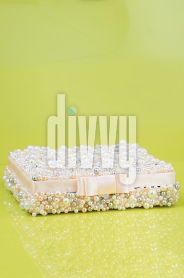 A decorative multi colored pearl box and a ribbon sits on a lime green background.