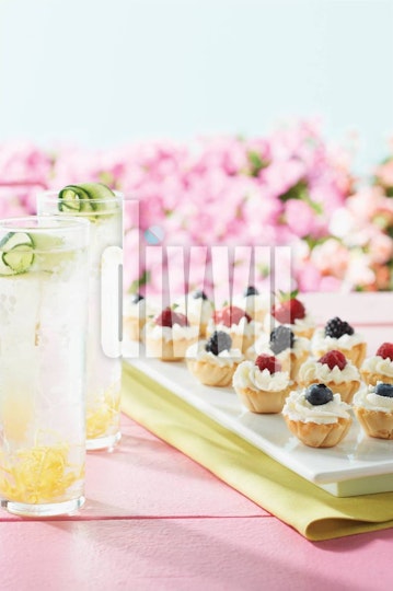 Phyllo shells are filled with a yogurt-cream mixture and topped with fresh summer berries. The tarts are served with cucumber-lemon zest drinks.