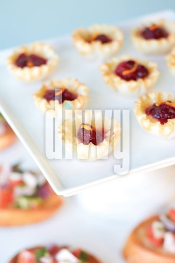 A cake stand holds cranberry-orange Brie tartlets garnished with a orange zest; other appetizers are out-of-focus in the background.