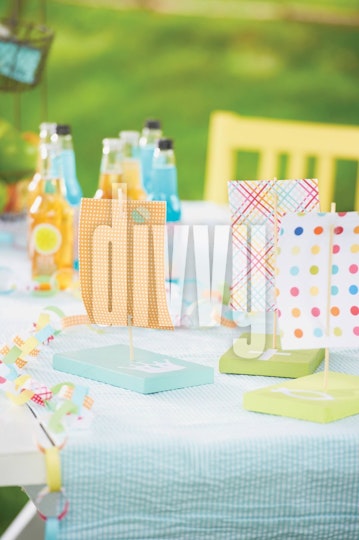 Homemade toy boats decorate a picnic table with a seersucker tablecloth and colorful bottles of soda.