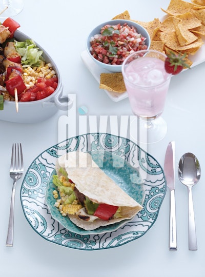 A taco is served on a plate with a glass of strawberry lemonade next to a plate of kabobs and a platter of chips and salsa.
