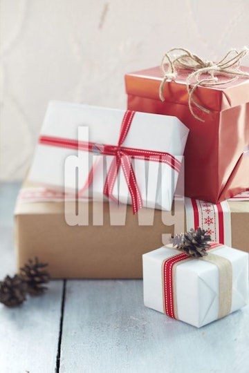 Pile of Christmas Presents on a Wood Table