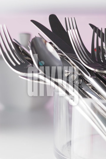 Silver flatware is collected in a glass container in front of a pale purple background.