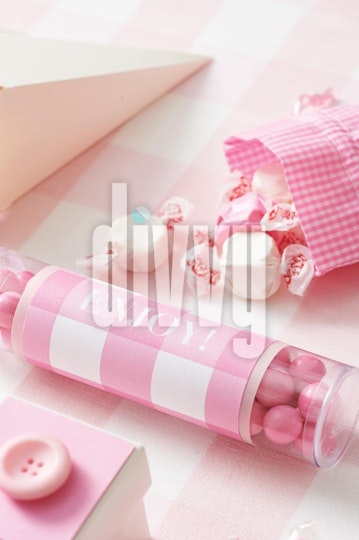Pink candies inside pink and white enjoy labeled tube beside pieces of white taffy candy in a pink plaid pouch.