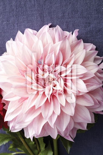 A light pink dahlia sits on a dark blue tablecloth.