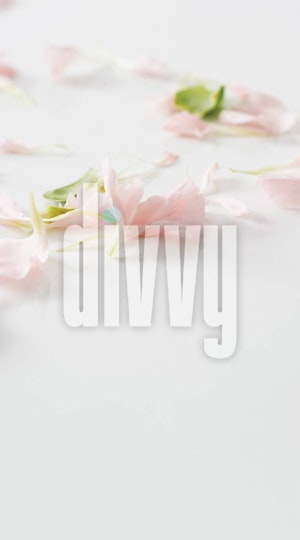 Pink flower petals and green leaves are scattered on a pale gray background.