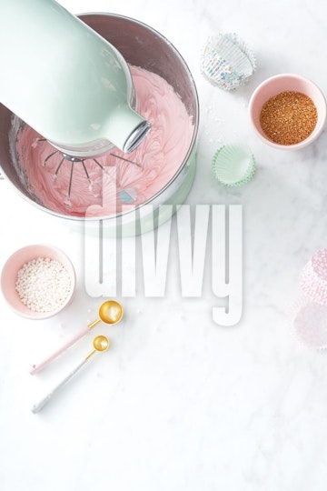 A mint stand mixer contains pink frosting, surrounded on a marble countertop by cupcake liner, bowls with decorative sprinkles and two gold measuring spoons.