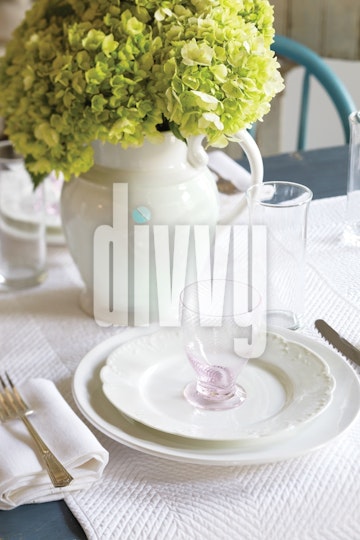 Decorative pink glass set in the middle of white plate in front of fresh green and white centerpiece on table.