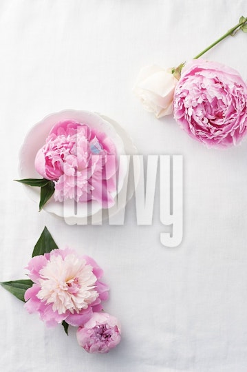Several pink peonies blossoms rest on a white tablecloth with a white rose.