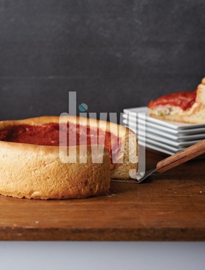 A slice is served from a deep dish Canadian bacon pizza on a wood surface.