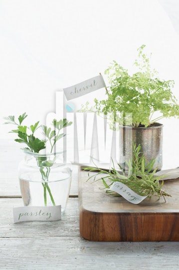 closeup of three fresh herbs with flag labels on a weathered white kitchen table.
