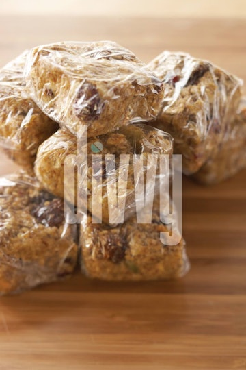 Homemade sunflower seed energy bars are individually wrapped in plastic wrap.