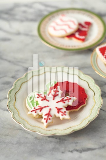 Ornate green-and-white plates serve decorated Christmas cookies on a marble surface.