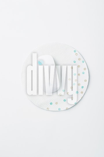 A computer mouse sits on a leather mouse pad painted with gold and teal polka dots.