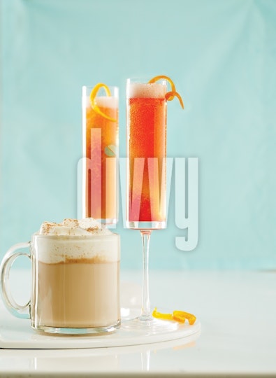 Two sparkling pomegranate cocktails are garnished with orange twists next to a hot buttered RumChata topped with whipped cream and ground nutmeg.