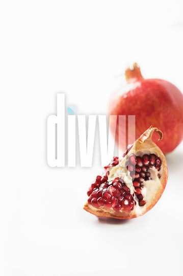 A section of pomegranate rests in front of a whole pomegranate in the background on a white surface.