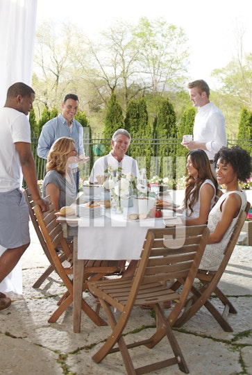 Friends and family sit at a table filled with food while enjoying a poolside dinner party during the summer.