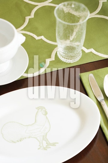 Porcelain plate with a pea green chicken design is part of a place setting on a dark wood table.