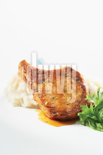 A bone-in pork chop drizzled with sauce leans against a pile of mashed potatoes next to some leafy greens on a white surface.