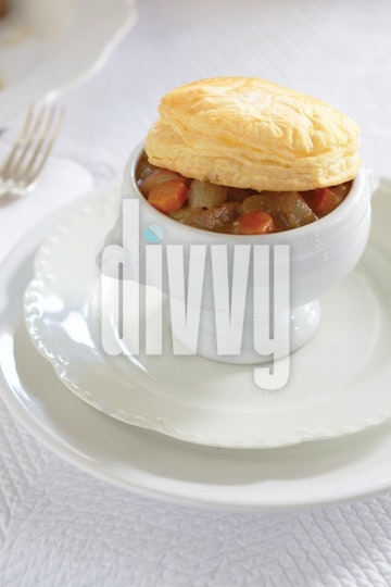 Small pot pie topped with flaky biscuit served in a white bowl set on top of white plates and tablecloth.