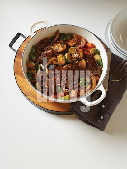 A pot roast is surrounded with onion wedges, carrots, celery, mushrooms, Brussels sprouts and gravy in a white Dutch oven.