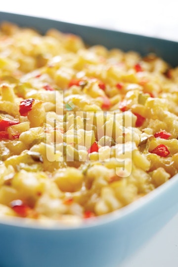 Cheesy potato casserole is flecked with bits of red and green bell peppers.