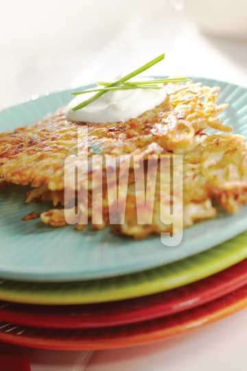 Two crispy potato pancakes topped with sour cream and a pile of chives rest on four stacked colorful plates.