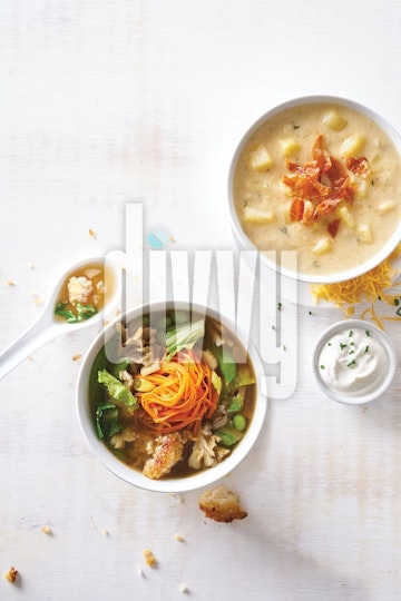 A bowl of creamy potato soup topped with crispy bacon is served next to a bowl of Asian vegetable soup with carrots, edamame, peas and crispy rice.