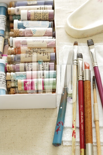 A box of paint pigments sits next to a pile of paintbrushes on a paper towel.