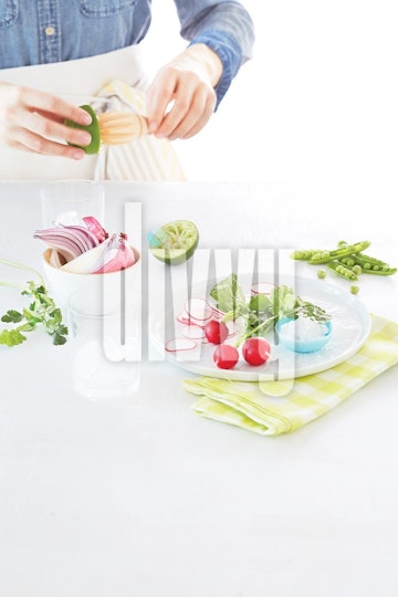 A woman juices a lime into a glass on a surface holding a plate of radishes, a bowl of onions, fresh cilantro and sugar snap peas.