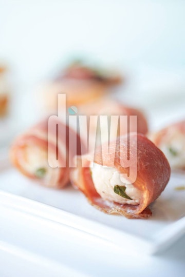 Prosciutto-wrapped scallops appetizers are served on a white plate.