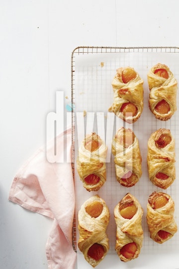 Fresh apricots fill puff pastries cooling on a wire rack.