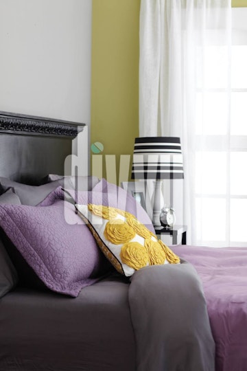 A bed is made up with gray sheets and topped with a purple comforter on a black wood bed frame.