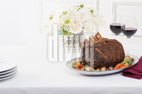 A beef rib roast is served on a platter with roasted Brussels sprouts, pearl onions and small carrots next to two glasses of red wine and a vase with a white floral arrangement.