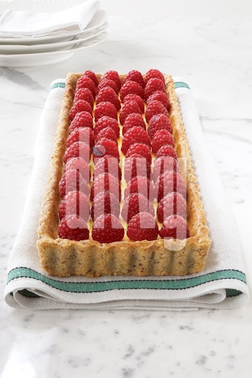 Raspberries and Cream Tart on a Marble Table