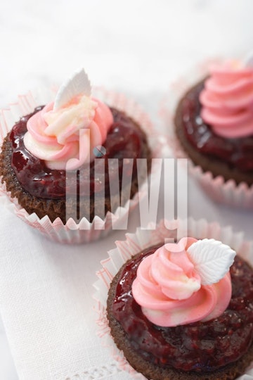 Three triple chocolate cupcakes with are decorated with raspberry jam, buttercream frosting and a candy leaf.
