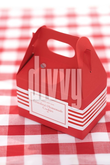 A red treat box sitting on a red and white picnic tablecloth.