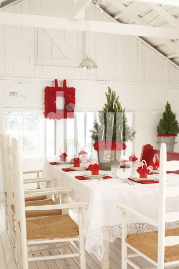 A small evergreen tree, potted in a tin pail with red carnations, is the centerpiece of a rustic red and white holiday table.