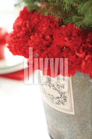 A tin pail holds red carnations surrounding the base of a small evergreen tree for a holiday centerpiece.