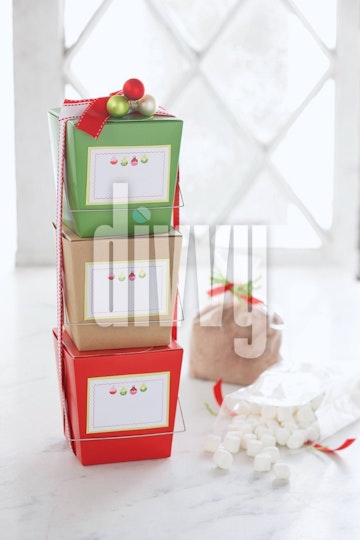 A red, green, and brown stacked boxes held together with a red and white ribbon, topped with three small ornaments. Cocoa mix and an open bag of marshmallows sit off to the side of the boxes.