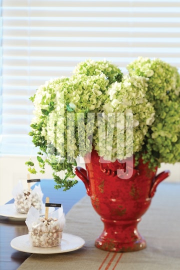 Rustic red vase filled with green flowers set on table with caramel apples placed around the base.