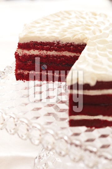 A layered red velvet cake with cream cheese frosting is served on a crystal cake stand.