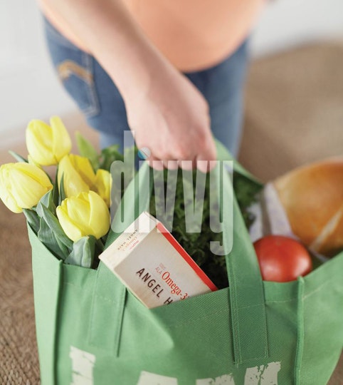 A woman holds green reusable bag containing a box of pasta, a bouquet of tulips, a loaf of bread and produce.