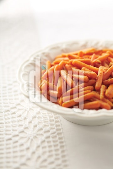 Ginger-roasted baby carrots are served in a white serving bowl.