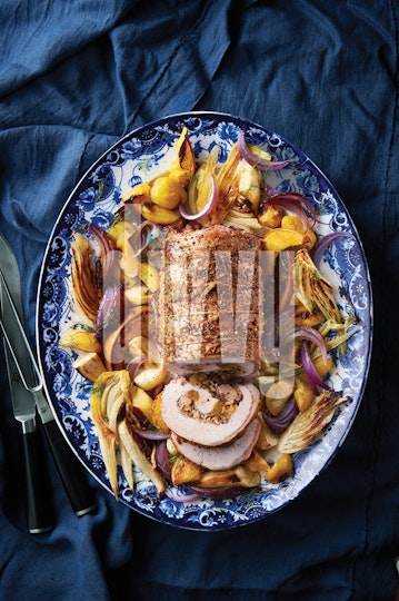 A pork loin stuffed with wild rice, apricots and pecans is served with slices on a platter surrounded by roasted vegetables on a dark blue tablecloth.