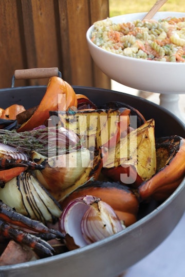 A pan of grilled roasted veggies and a bowl of homemade pasta salad are served as part of a buffet at an outdoor fall party.