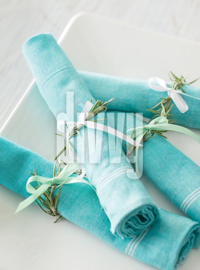 Four turquoise napkins rolled and tied with greenery and white ribbon rest on a white platter.