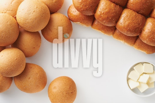 Wheat and white rolls are arranged on a white surface with a dish holding pats of butter.