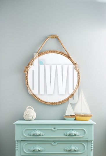 A rope-wrapped mirror hangs from cleat over an aqua blue antique dresser with nautical items on top.