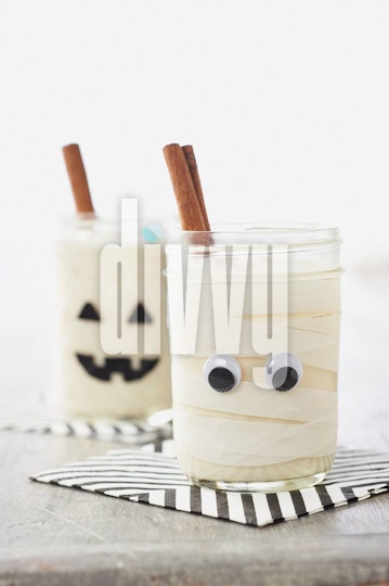 Two RumChata-whiskey Halloween cocktails with a cinnamon stick garnish are served in decorated mummy and jack o'lantern mason jars on a gray surface in front of a white background.